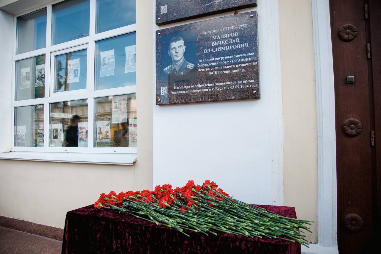 У мемориальной доски выпускника вуза, майора спецподразделения ФСБ «Альфа» Вячеслава Владимировича Малярова, героически погибшего при освобождении заложников в Беслане, состоялся митинг и возложение цветов.