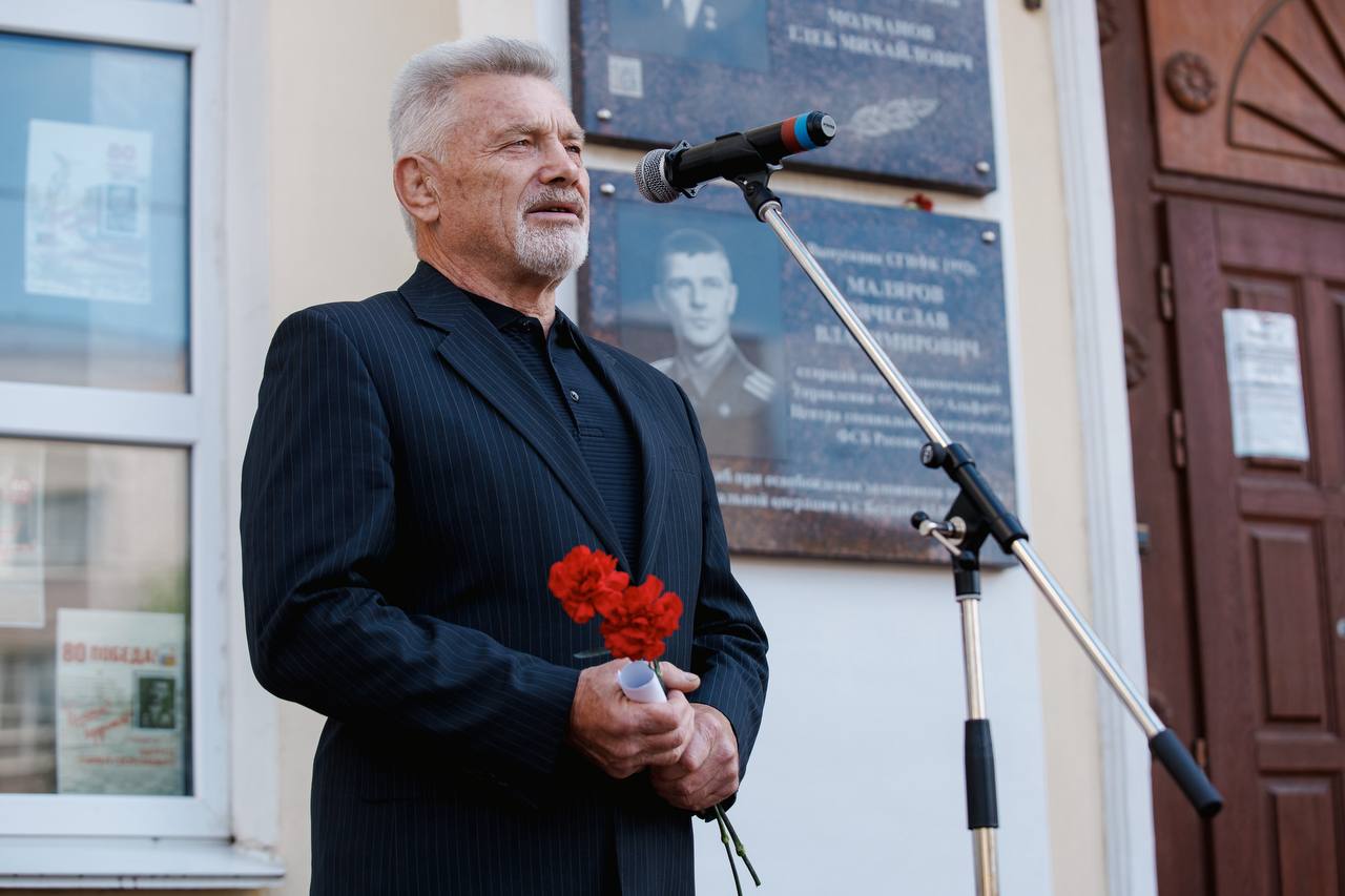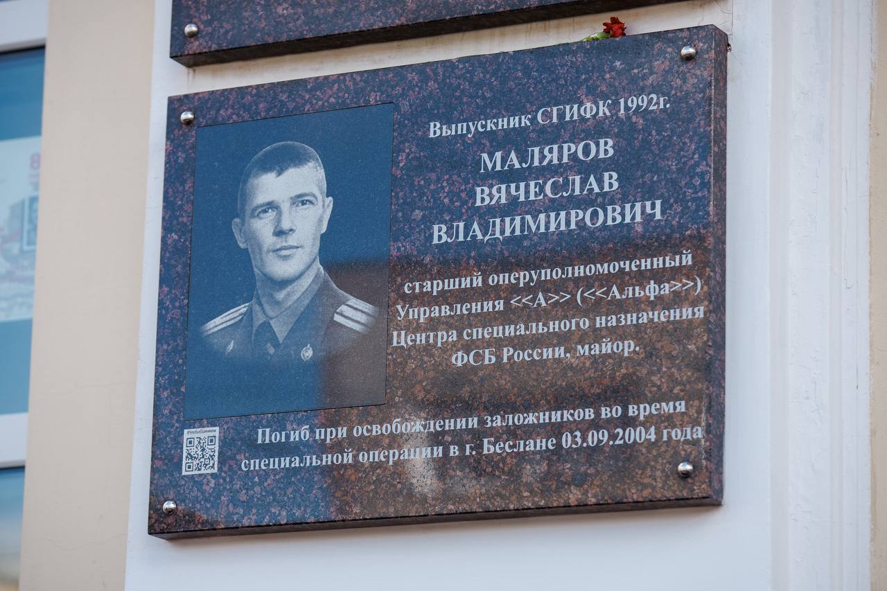 У мемориальной доски выпускника вуза, майора спецподразделения ФСБ «Альфа» Вячеслава Владимировича Малярова, героически погибшего при освобождении заложников в Беслане, состоялся митинг и возложение цветов.