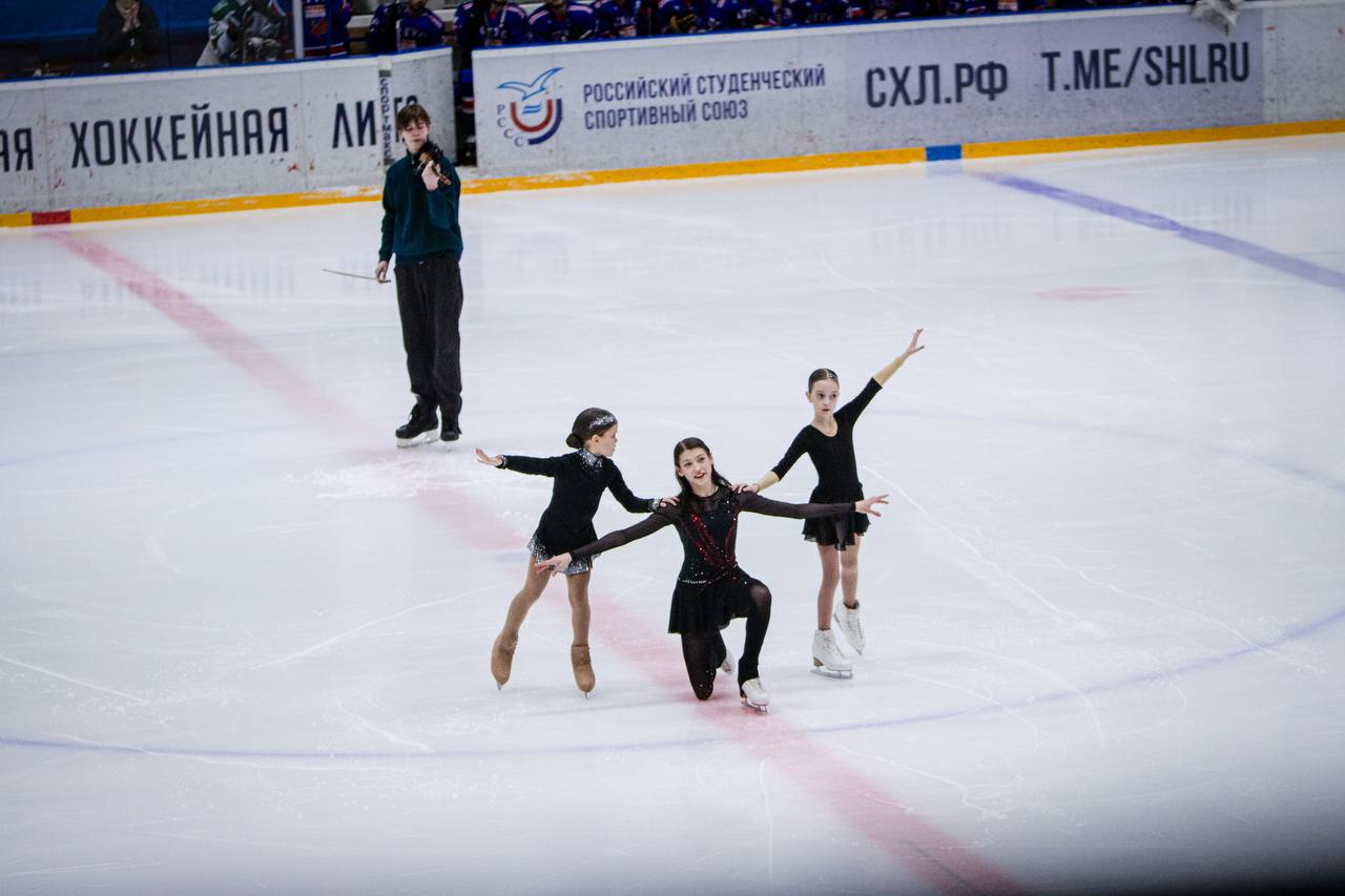 В перерыве между периодами под аккомпанемент скрипки Тихона Шнякова для зрителей выступили воспитанники спортивного клуба детско-юношеского спорта СГУС (тренер Екатерина Фагурел).