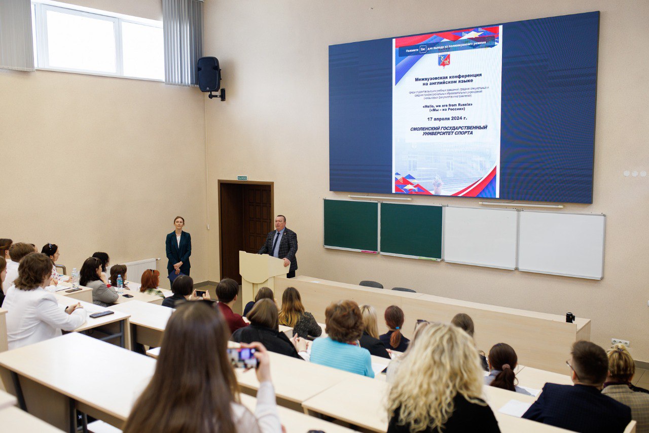 17 апреля 2024 года в Смоленском государственном университете спорта прошла I Конференция на английском языке среди студентов высших учебных заведений, средних специальных и средних профессиональных образовательных учреждений (неязыковых факультетов и направлений) «Hello, we are from Russia» («Мы – из России»).