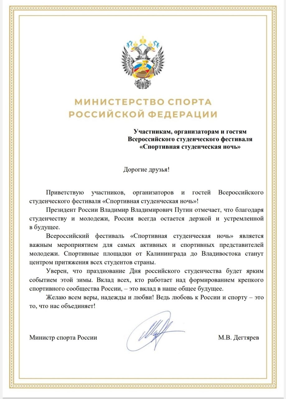 Министр спорта России — Михаил Дегтярёв, поздравляет молодежь с Днем российского студенчества