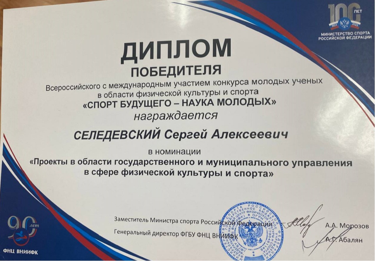 В номинации «Проекты в области государственного и муниципального управления в сфере физической культуры и спорта» победителем стал аспирант 1 года обучения Селедевский Сергей, научный руководитель д.п.н., доцент Родин А.В.
